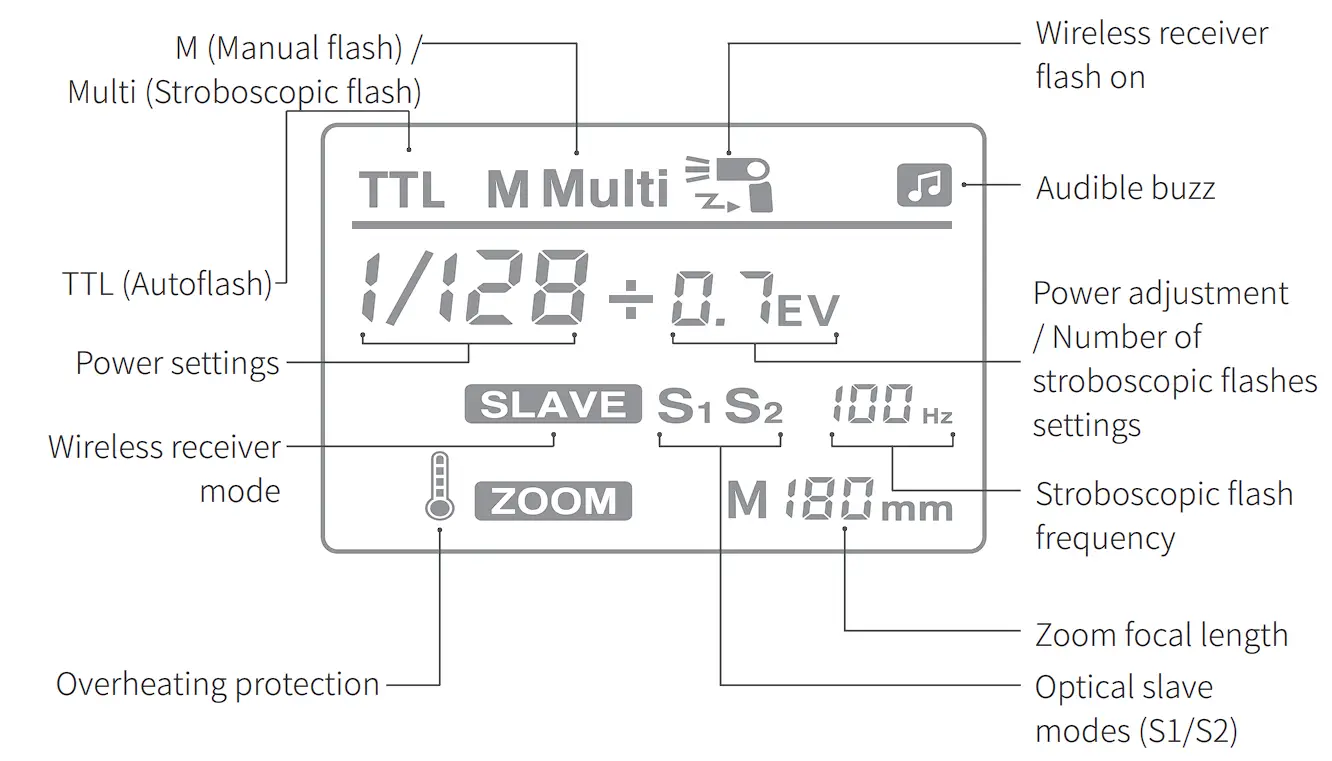 | Flash Mode | TTL mode, manual mode (M), stroboscopic flash m ode (Multi), optical slave mode S1, optical slave mode S2 |