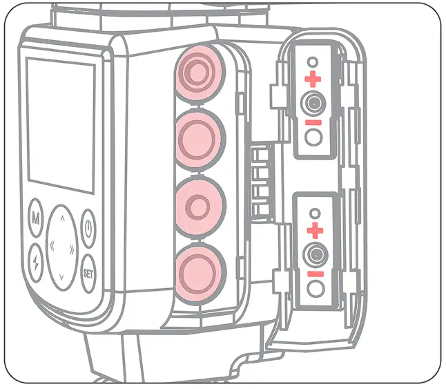 To supply power to the flash capacitor, please purchase the flash power supply (not included) separately. When using the power supply, AA batteries must also be inserted in the battery compartment. - Inserting AA batteries
