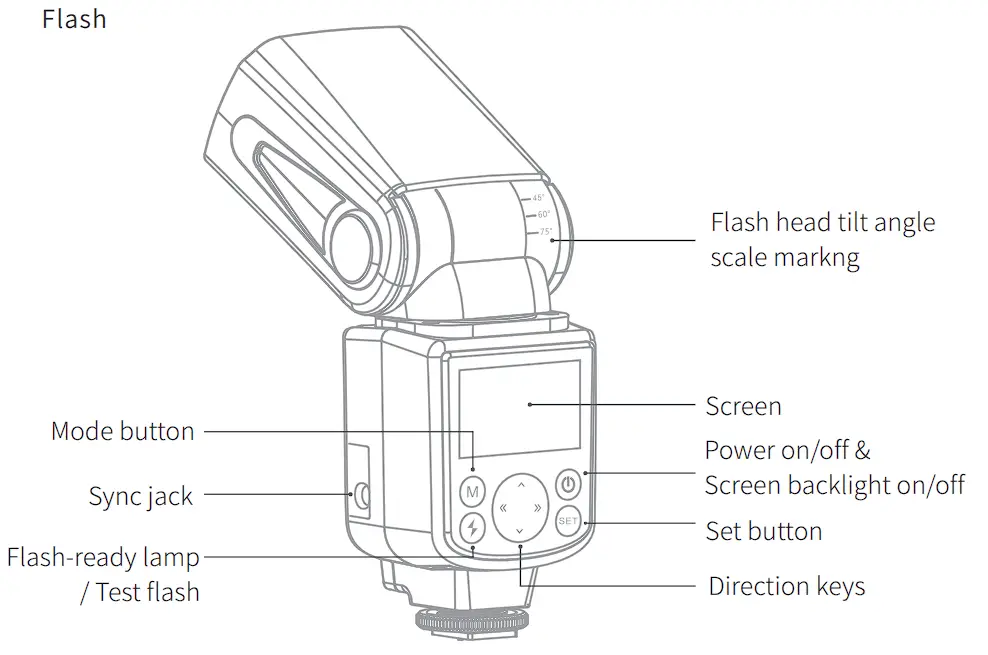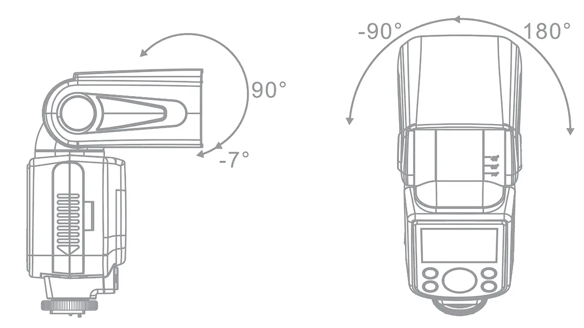 The flash head can be tilted up by 90 degrees, down by-7 degrees, and rotated horizontally by-90 to 180 degrees. Pointing the flash head towards a ceiling or wall will produce a “bouce flash” to make the picture look more natural with fewer hard shadows. - Mounting the flash