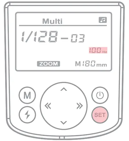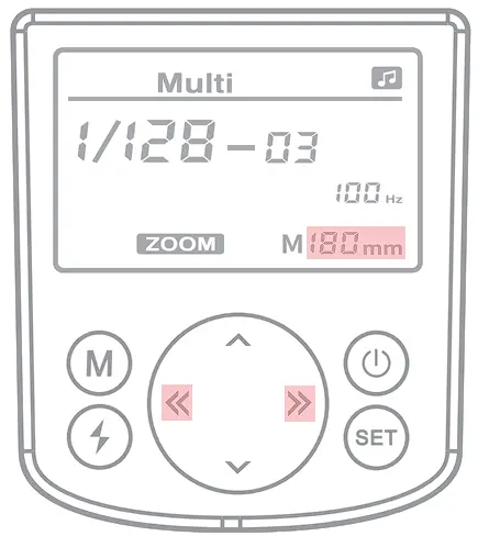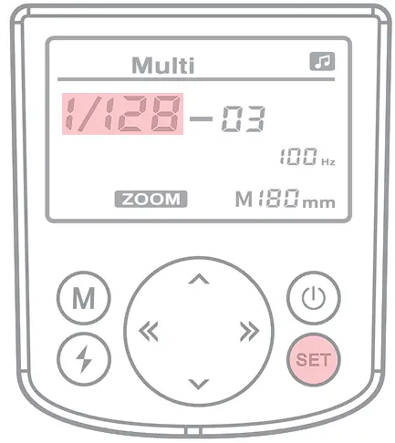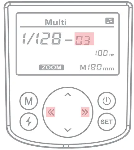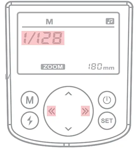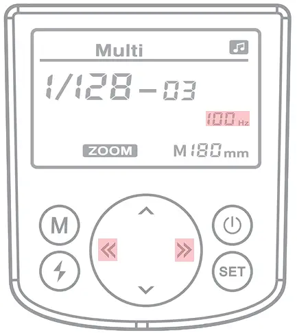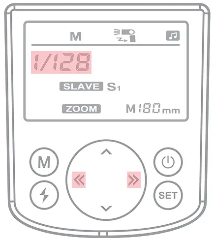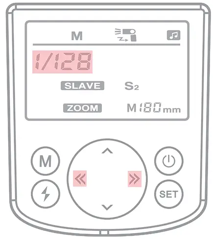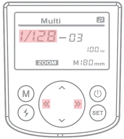 2: Press the”<<” or”>>” button to set the flash frequency 1/128➔ 1/64➔ 1/32➔ … ➔ 1/4.