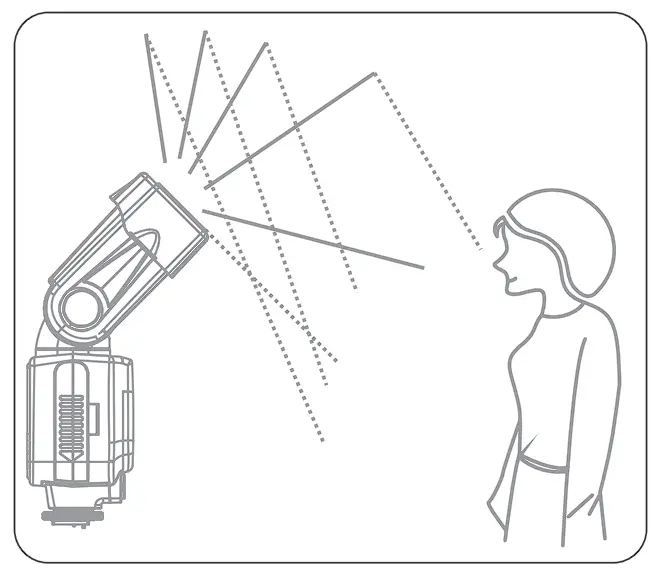 The purpose of the diffuser is to diffuse the light produced by the flash unit, converting it into an effective soft light without shadows. The effect is almost the same as when using a fill light with you r camera. Good results are usually obtained when the flash head is ti lted up by 60 degrees.