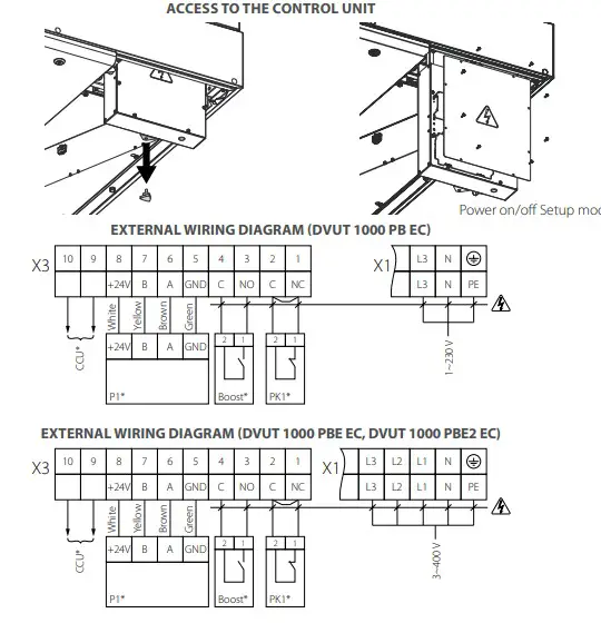 The control unit is positioned inside the unit casing. To access the control unit, remove the fixing screws on the panel and remove the control unit lid.