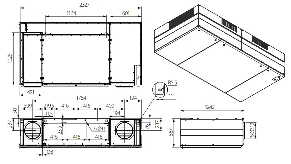The unit is designed to ensure continuous mechanical air exchange in houses, offices, hotels, cafes, conference halls, and other utility and public spaces as well as to recover the heat energy contained in the air extracted from the premises to warm up the filtered stream of intake air.
