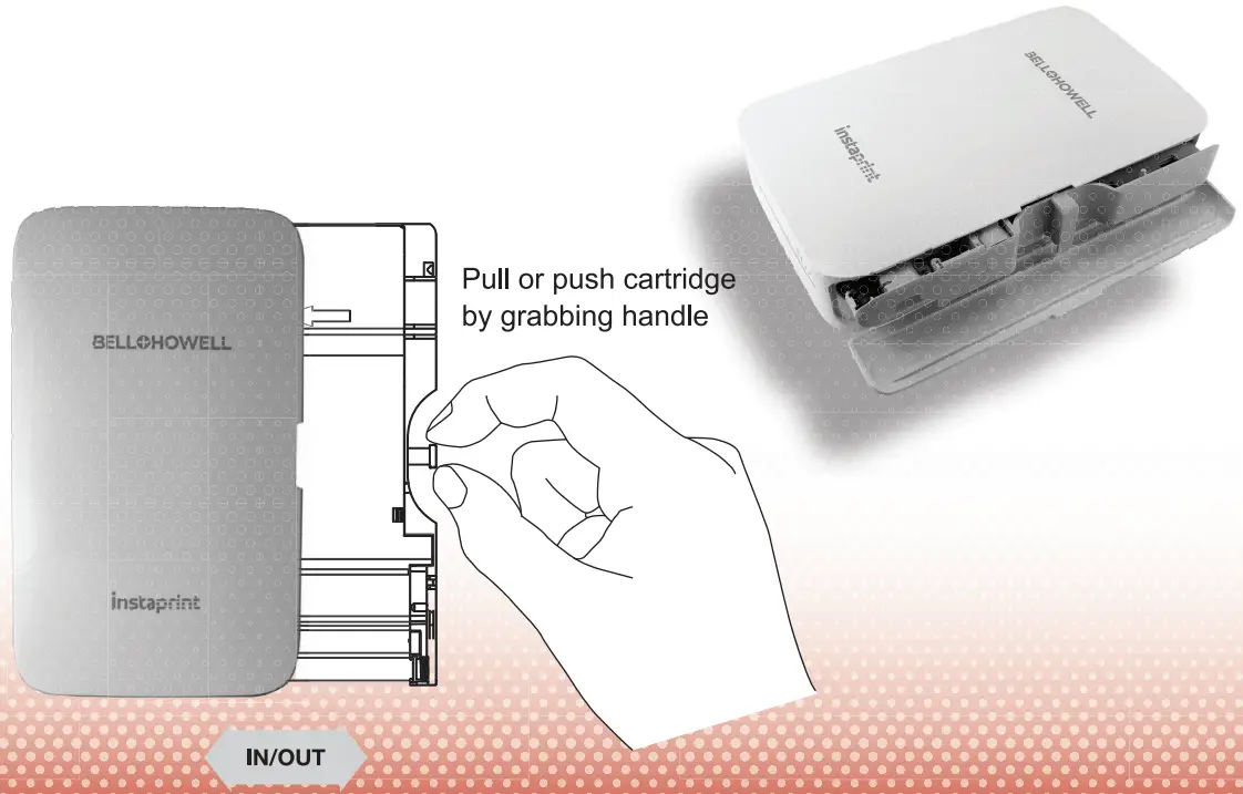 Your printer includes a 10-paper cartridge. Insert the paper+ink cartridge as shown. The cartridge can only be inserted in one way.