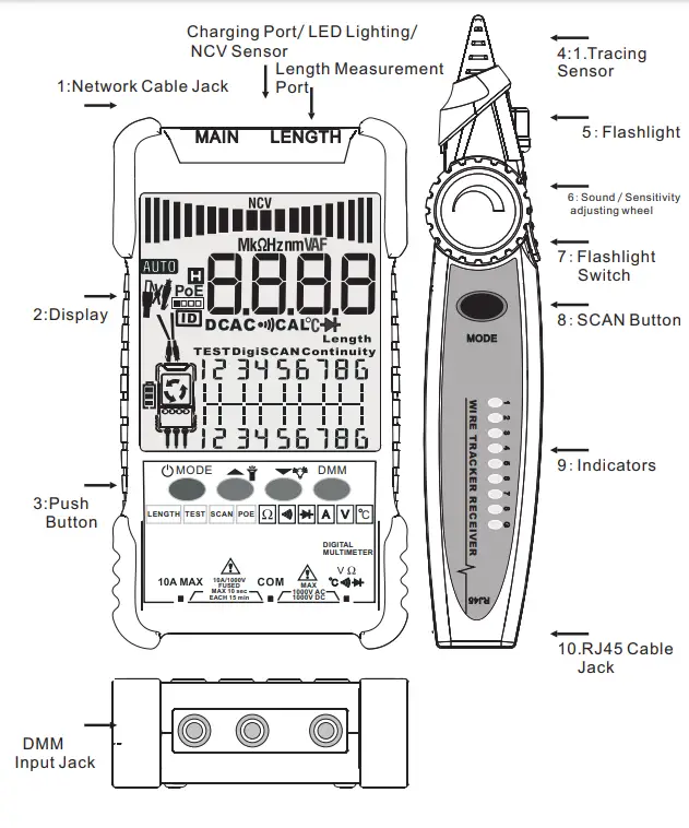 dress to select the multimeter function. In the multimeter function, press to select ACV- DCV -Continuity – Diode – Temperature – NVC – Resistance – ACA – DCA) - Tracking Sensor: Move this part towards the target cable (network cable, phone line, BNC cable, or another metallic cable). Listen to the sound level to position the target cable.