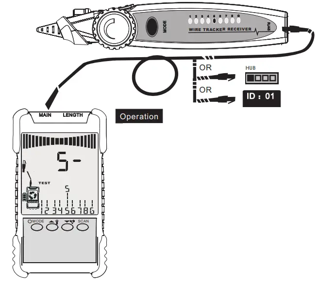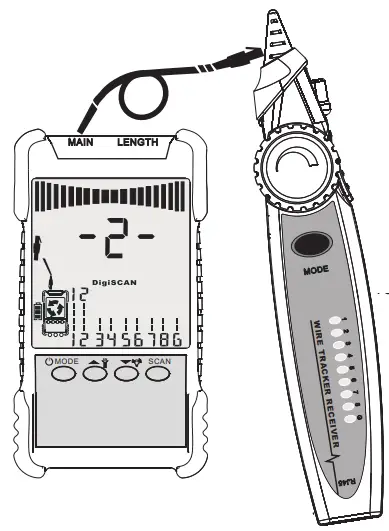 Operation of the main body is the same. The receiver operation is different. Press SCAN button for 2 seconds to switch on. Press to switch between digital cable tracing, digital tracing with vibration (if the model has), and analog cable tracing. Press 2 for 2 seconds to switch off. The product will automatically switch off if no operation for 10 minutes. After selecting the function of the Receiver by pressing the SCAN button, it is no need to press the button. Press SCAN button on the Main Body to select the searching function. Press the Hz button to switch to the digital search (L2) mode. In digital search mode, it is not allowed to change the search frequency. To speed up the searching process, it is recommended to maximize the sensitivity by turning the Sensitivity adjusting wheel. When the target cable is closed, adjust the sensitivity to identify the target cable. To confirm the target cable is the correct cable to be searched, it is recommended to plug the target cable in the RJ45 jack on the Receiver. If all the LED on the Receiver are switched on, the cable connection is the target cable.