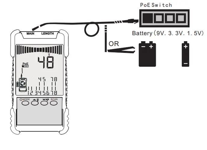 After switching on the product, press MODE button until it is ready at Voltage Testing Mode. Connect the target battery or other power sources by using the alligator clip cables provided. The polarity will be displayed. After switching on the product, press the MODE button until POE and V is shown on the display. The product is now ready at Voltage Testing mode. It will display the voltage and polarity. The number of the positive conductor will be flash.