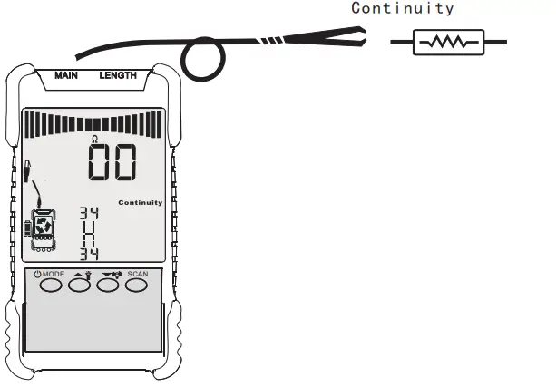 The function is to test the short circuit of a phone line that is not plugged into any network. Ensure the phone line is not powered before testing. The display will indicate an open circuit. For those cables with registered jack, directly plug the cable in the MAIN/RJ45 to test. Otherwise, connect the testing cable by using the alligator clips provided. This function can also apply to test the continuity of other equipment. The product will display whether the circuit is opened or not.