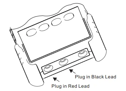 1. Plug the black lead to the COM jack. Red lead in the VHz jack (Please be noted that the polarity of the red lead is “+” ).