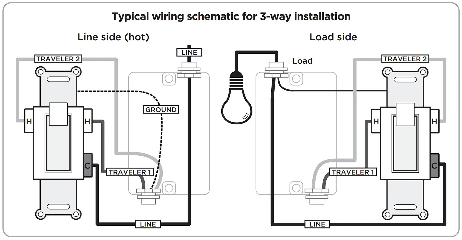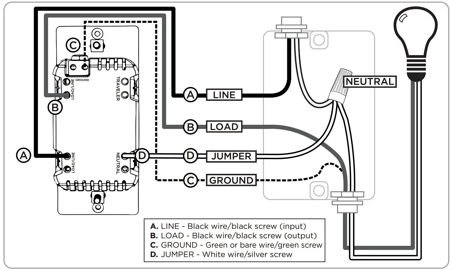 - Screw terminal installation requires wiring connections for line (hot), load, neutral and ground. Traveler wire required for 3-way installation