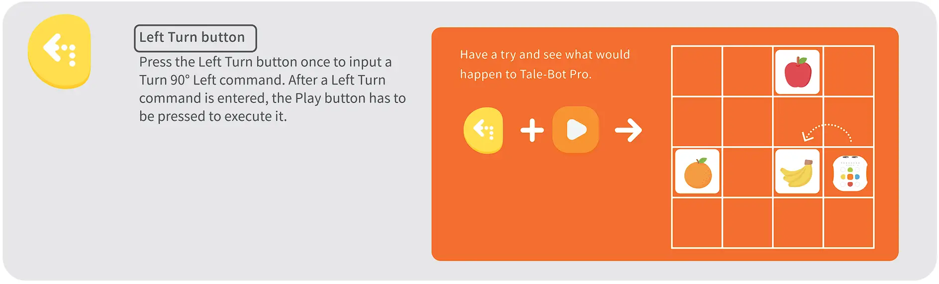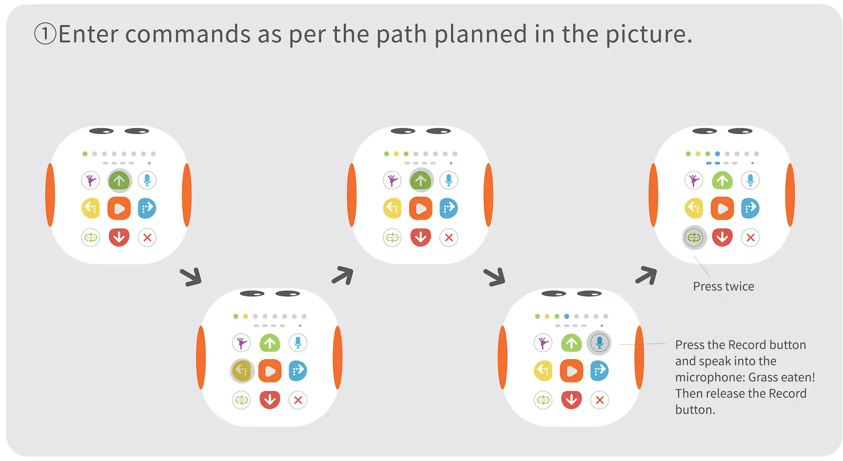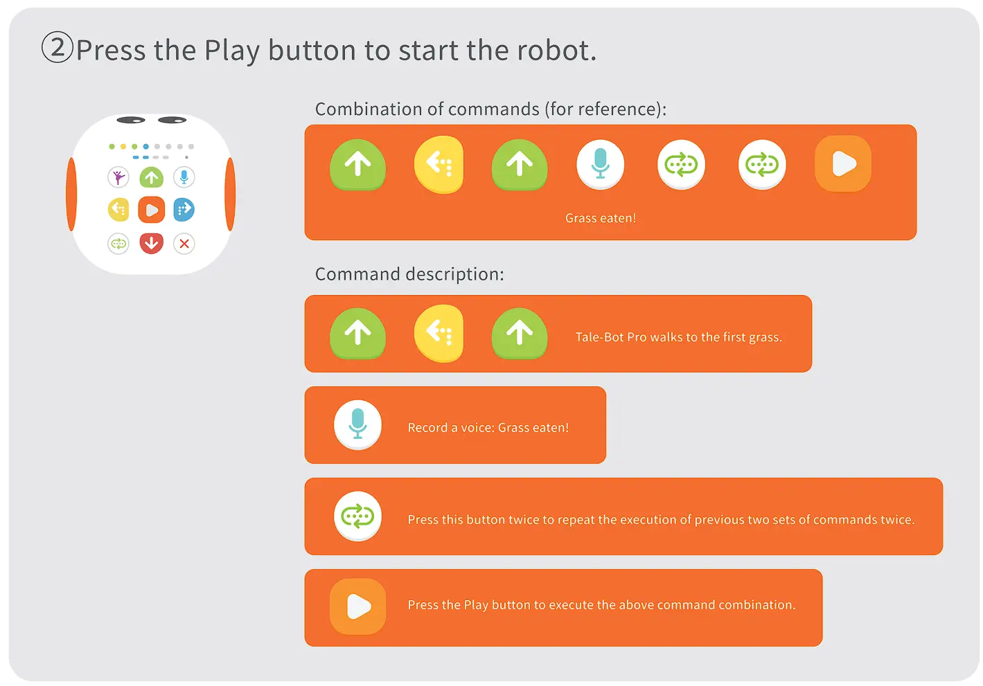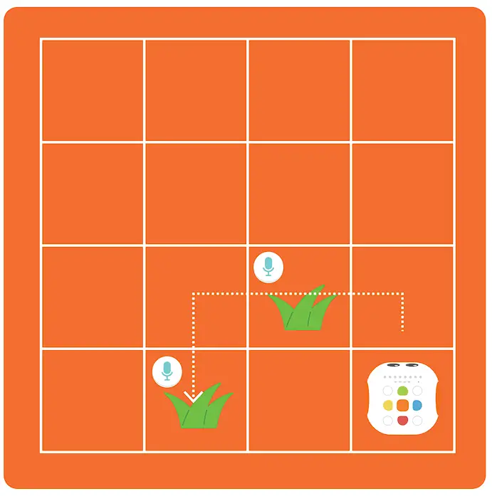 Help Tale-Bot Pro walk along the path planned in the picture below by coding commands to eat the two blades of grass, and make Tale-Bot Pro say “Grass eaten!” every time it eats one!