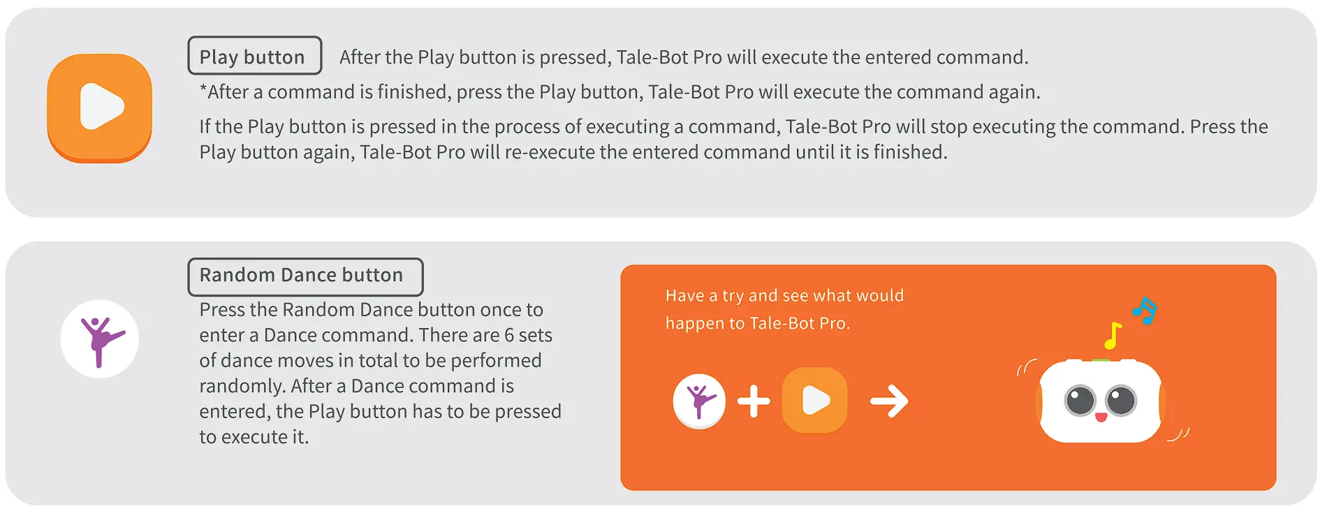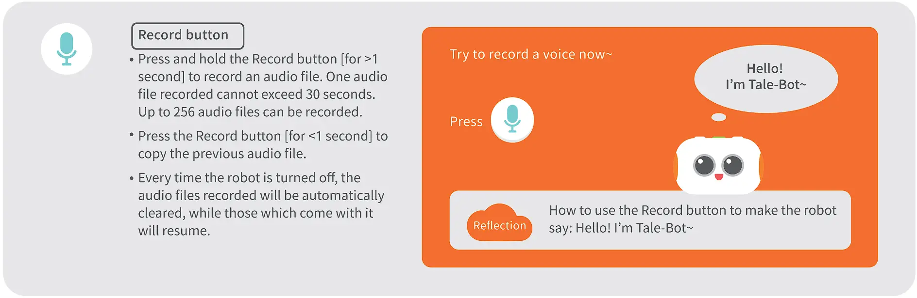 *Tale-Bot Pro will turn off automatically when its battery level is less than 5% or if not used after 1 hour.
