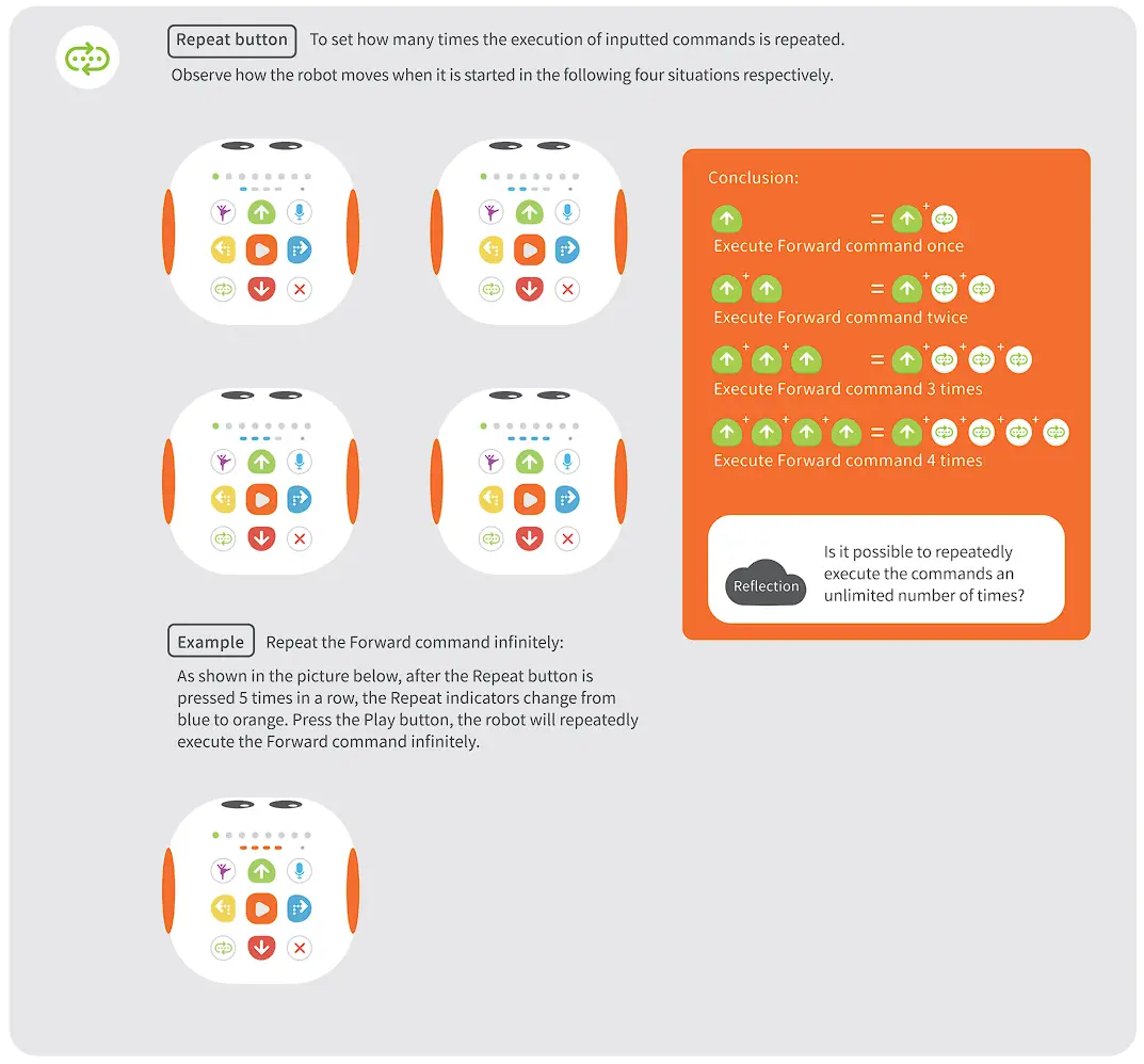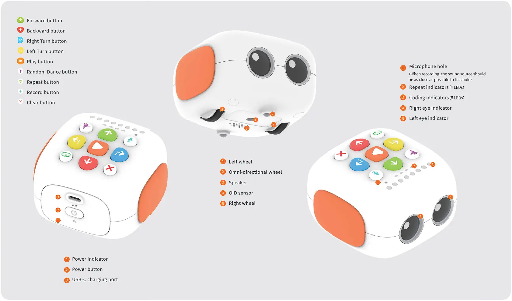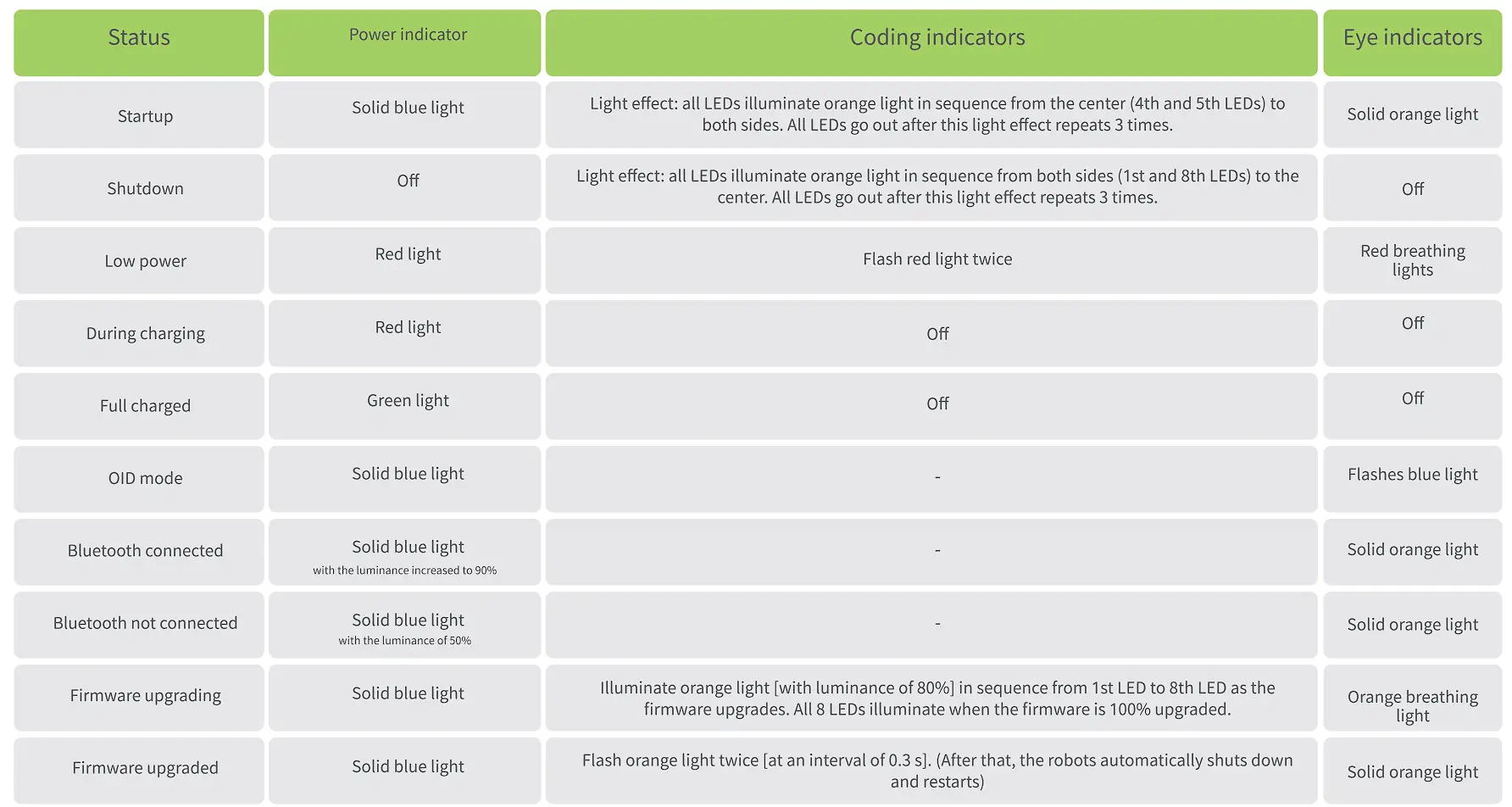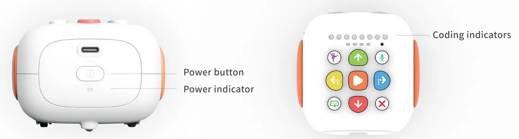 Press and hold the Power button for 1 second, until the startup music rings, the power indicator turns into solid blue, the left & right eye indicators turn into solid orange and the coding indicator flashes startup lights.