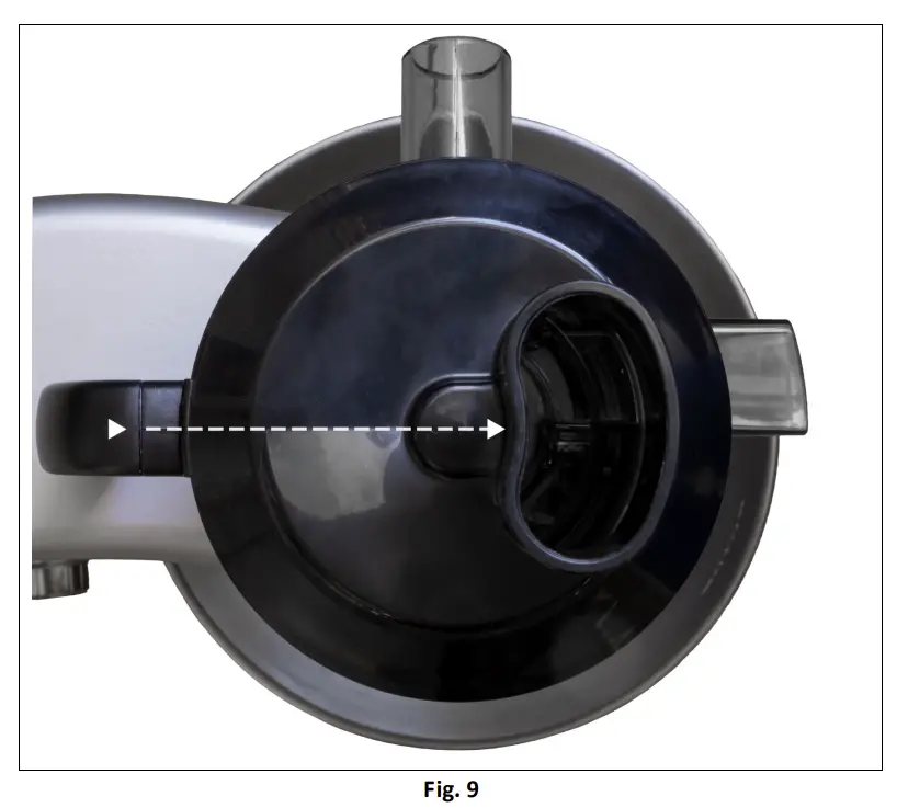 | !!! The juicer must be assembled in such a way that the arrow on the juicer holder is at the opposite end to the filling hole (Fig. 9). Only with this set-up the safety switch is pressed and the motor can be started. |