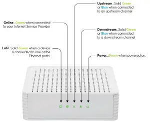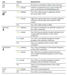 When the start-up procedure is completed, the Power LED lights will be solid green. - Wait for the cable modem to come online. It can take up to 10 minutes for the cable modem to come online on your network. During this time, the LED behavior is as follows:The Downstream LED lights blinks green when more searching for a downstream frequency. The Downstream LED lights solid green when a downstream
