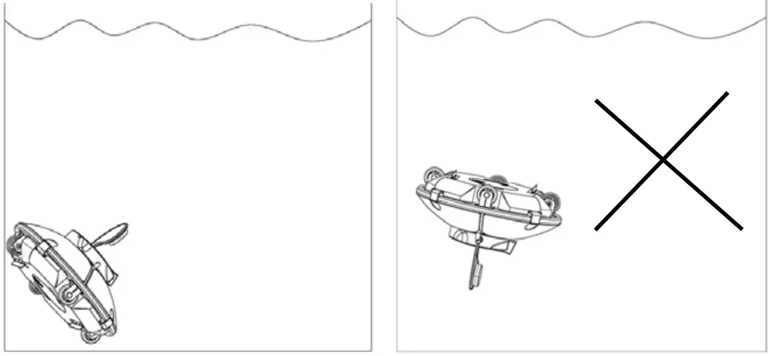 Put the cleaner into water and let it stand vertically under the water for 5-6 seconds to dischargethe air inside it. Press the switch to power on the cleaner. and lower the pool robot horizontally to the pool floor.