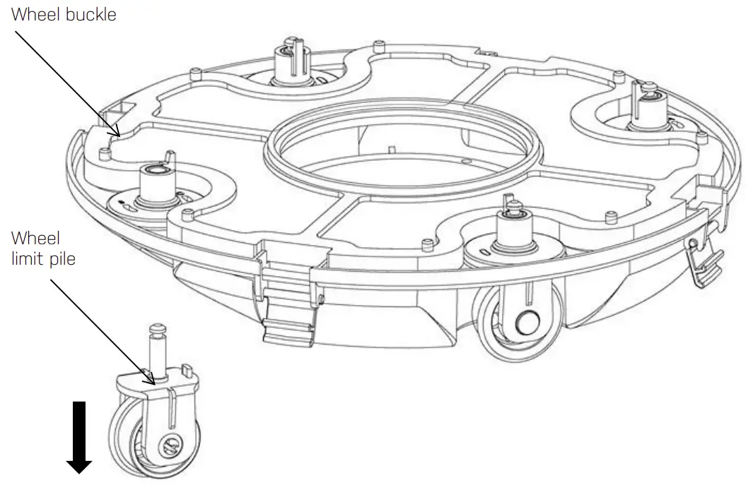 As shown in the figure, push the wheel buckle, pull down the wheel components, and remove them. Then reinstall the limit pile into chassis to realize the different running paths