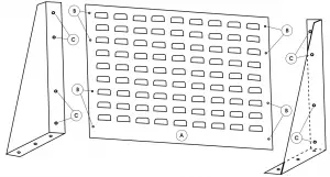 - Hold the louvered panel (A) in one hand, and line up holes (B) (stamped into the left and right side of the panel) to matching holes (C) stamped into each side of the support panel.