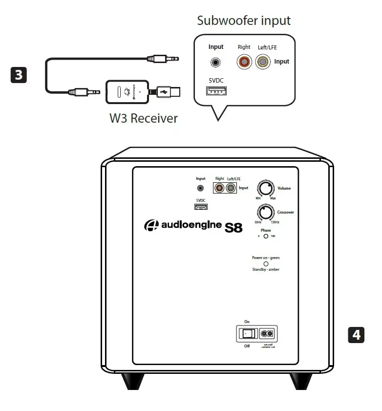 music system with an audio output to the S8 Subwoofer.Here are the two most common setups to make your S8 subwoofer wireless using the included Audioengine W3 wireless adapter kit.