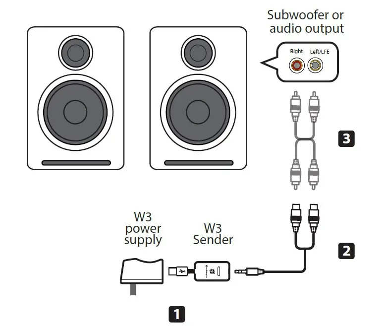 - If your powered speakers or AV receiver has RCA-style audio outputs or sub outputs, connect the included RCA adapter “Y” cable to the W3 Sender.