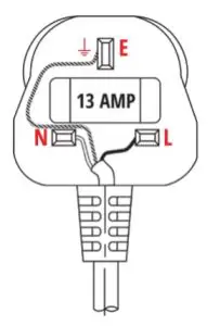 The product must be earthed. This appliance is fitted with a 13A BS1362 fuse in a 13A BS 1363 plug. To replace the plug, fit the green-yellow wire to or E, blue wire to N and the brown wire to L. Fit the cord grip. If in doubt, call a qualified electrician. If you remove the plug, dispose of it.