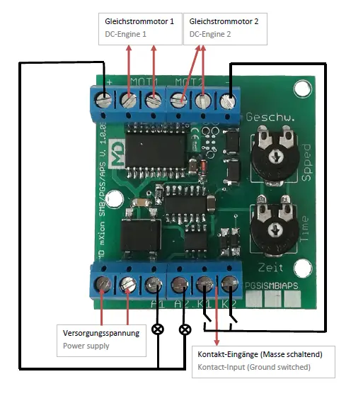 The mXion SMB is a versatile module. Ideally, it is to control railway crossings too.It is possible to connect one motor to one It is possible to connect one motor to one alternately suitable for barrier movement (A1/A2). The contacts K1/K2 switch depending on the direction, i.e. if K1 has been switched first, K2 must be switched to be able to start the barrier again and vice versa. This makes it possible to use the module in div. modes. The module can be used both, analog & digital In analog, the contact inputs can be simply switched by the switch, push, reed or light barrier. In digital, you can use all the same as in analog mode, but the simplest way is to make a short cut-out piece of track (e.g. 2 cm) that driving trains will close this piece and switch the SMBs K1 or K2. This solution is the easiest way to control in an automatic way. The speed and travel time of the engines can be adjusted via the 2 pots. The two outputs A1 and A2 enter alternating flashing while the engine is moving.