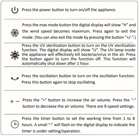 - The digital display will extinguish in approx. 20 seconds with no operations. If you want to do further operations, firstly press any button (except for the power button) on the remote control or press the touch screen button on the fan body to turn on the digital display and then press your desired buttons to choose your desired functions.