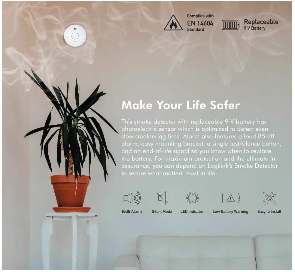 Logilink SC0015 Smoke Detector with Replaceable 9V Battery