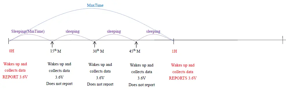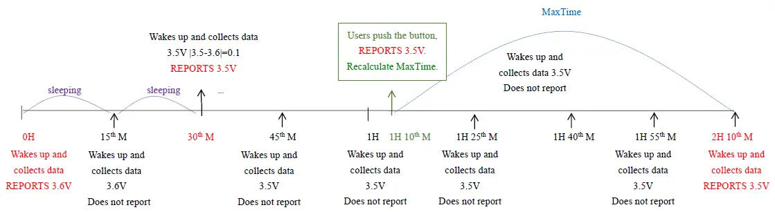 Example#2 based on Min Time = 15 Minutes, Max Time= 1 Hour, Reportable Change i.e. Battery Voltage Change= 0.1V.