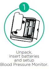 Unpack, insert batteries and setup Blood Pressure Monitor.