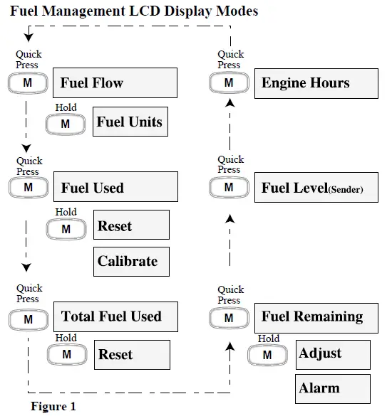 This display is based on your manually entered information (see Adjust Fuel Remaining below) and the accumulated Fuel Flow data since the gauge was adjusted. This information is not obtained from the fuel sender in the fuel tank and therefore is not affected by the boats position or angle as the fuel sender may be. There is an alarm which may be set to warn of a low fuel condition. The amount of Fuel Remaining and the Fuel Remaining Alarm may be adjusted using the submenu. Pressing and holding the “Mode” button causes the display to change to the “settings” submenu (see Figure 1).