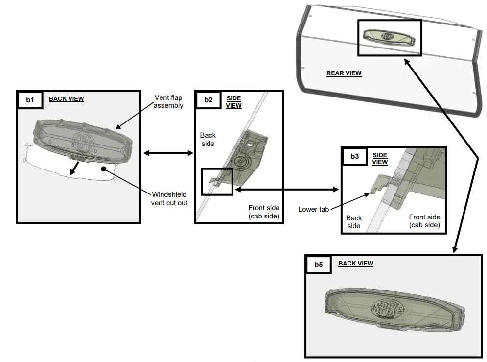 a. From the front side (cab side) of the windshield, slide the vent flap assembly (Item B) in the vent cut out as shown in image b1. Ensure the lower tab nests into the front of the windshield as shown in image b2 & b3