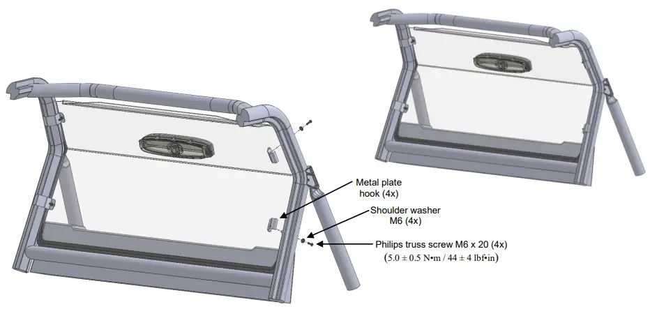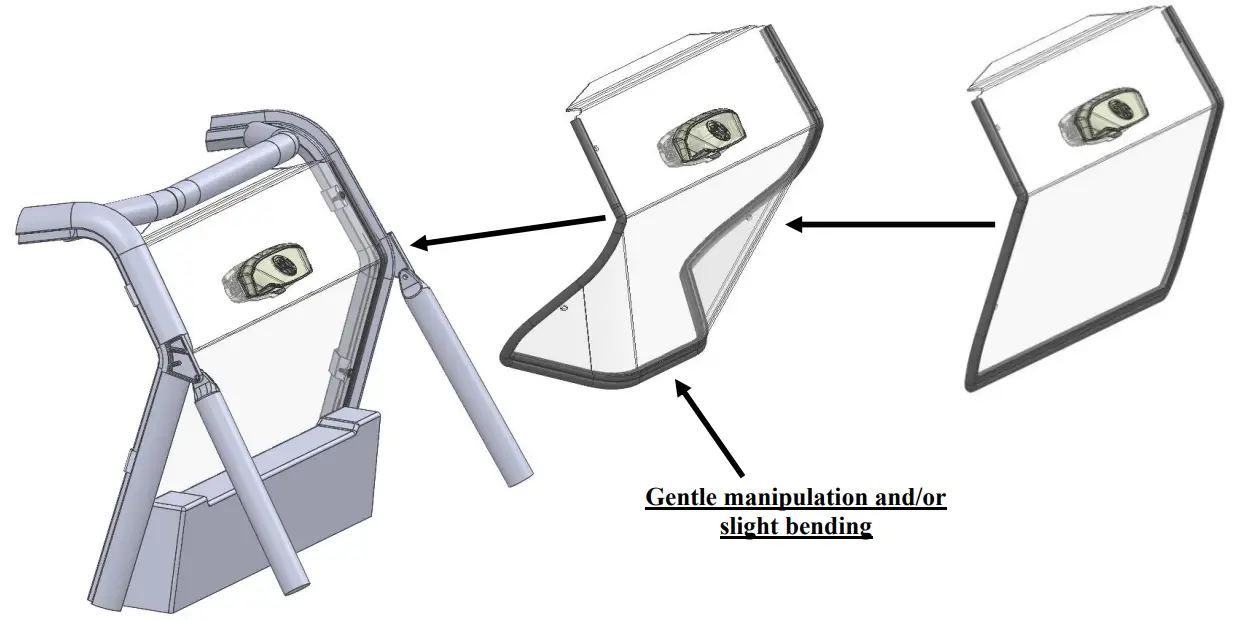 | TWO people are required to install the windshield to the roll cage. Since windshield is wider at the bottom, gentle manipulation and/or slight bending by each person will be required for windshield to slide all the way down into position Warning: Exercise extreme care during the next step in order to ensure that you do not damage the windshield or vehicle. This is a tight fit. |