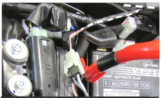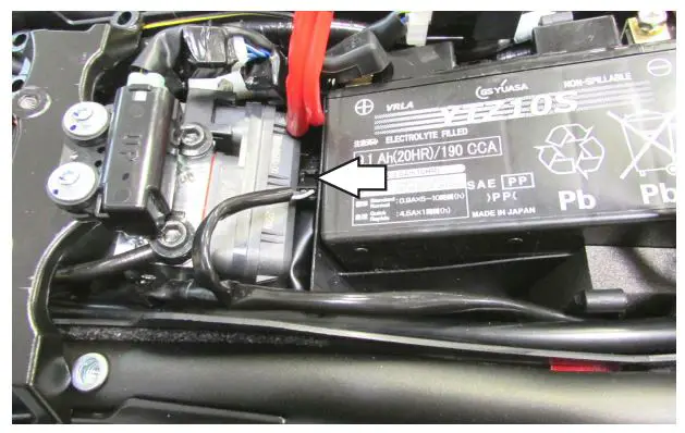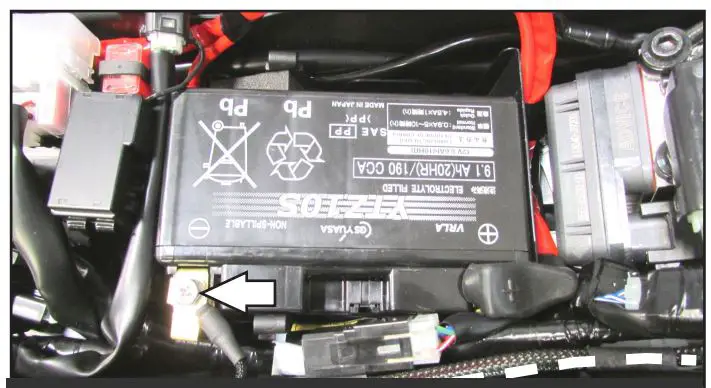 - Secure the PC6 ground wire with the ring lug to the negative (-) terminal of the bike’s battery