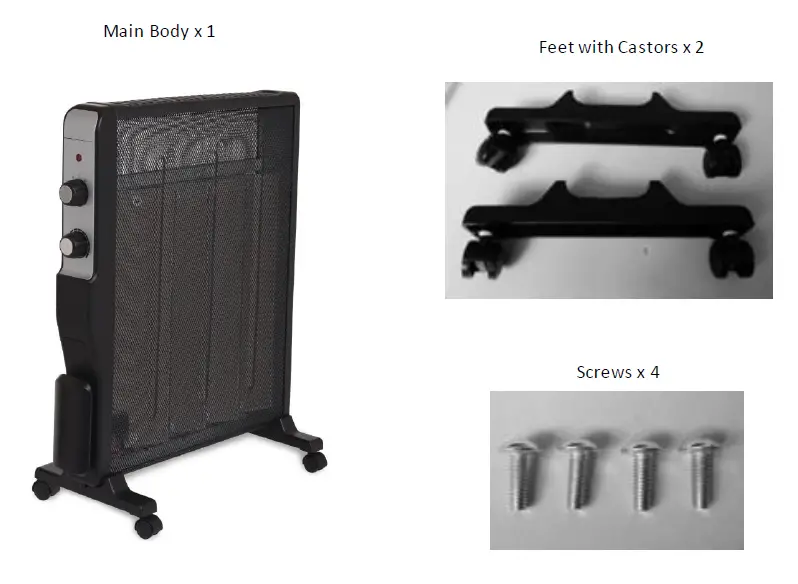 WARNING: Heater must not be used without the feet, castors, wheels fitted.