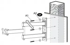 Install the wall plate [01] using lag bolts [A 1] and washer [A2]. Tighten the lag bolts [A 1] only until the washers [A2] are pulled firmly against the wall plate [01].