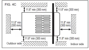 Side louvers and the rear of the air conditioner must have clear air space to allow enough airflow through the condenser, for heat removal. The rear of the unit must be outdoors, not inside a building or garage. There should be at least 11.8 inches (300mm) clearance around the unit. See FIG. 4C & FIG. 4D.