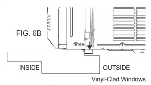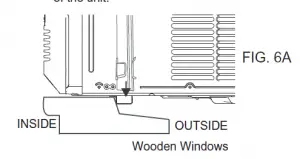 Keep a firm grip on the air conditioner, carefully place the unit into the window opening so the bottom of the air conditioner frame is against the window sill (FIG. 6A & FIG. 6B). Carefully close the window behind the top rail of the unit.
