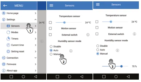 Go to the SettingsSensors menu, set and activate the temperature sensor. Thereafter, adjustment of other sensors is not possible. Then set the temperature threshold. If the temperature threshold is exceeded longer than the turn-on delay timer, the fan will switch to the MAX high speed to remove excess heat. After the room temperature drops 4 °C below the set threshold, the fan switches to the previous mode.
