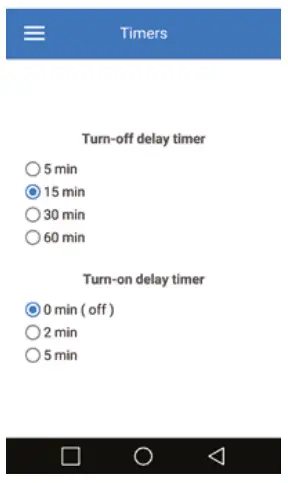 To configure the timers, go to the SettingsTimers menu. Turn-off delay timer is designed to prolong the fan operation in the mode caused by sensor triggering or Boost Mode activation, after sensor threshold values are not exceeded any more. The operating time of the timer may be terminated: