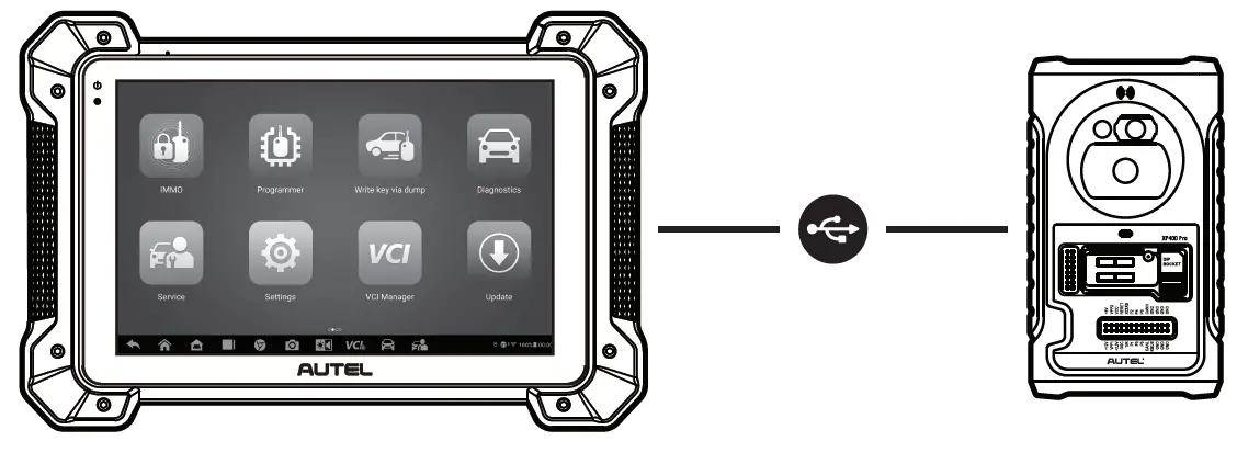 - Pair up the key programming tool with the VCI device via Bluetooth or the included USB cable (2m) to establish a communication link and your key programming tool is now ready for use.