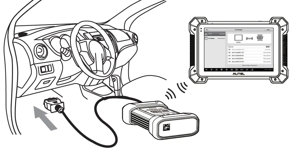 Connect the VCI with the vehicle’s DLC, which is generally located under the vehicle dash.
