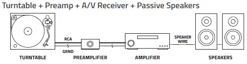 An amplifier is the most important electronic when using passive speakers. The amplifier provides the power to drive the speakers. Some integrated amplifiers have a Phono input that uses a built-in preamplifier. An AV Receiver, with a built-in amplifier, can also be used.