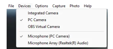 - Menu>Devices This menu will show the available video devices to host PC. The UB0240 is named PC Camera. This camera supports capturing audio, so you also need to choose a Microphone (PC Camera).
