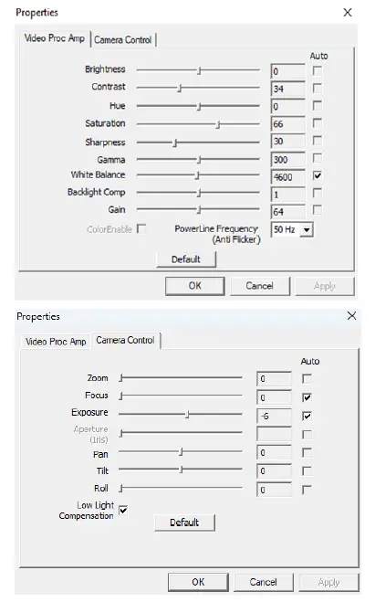 Video Capture Filter -> Video Proc Amp/Camera Control