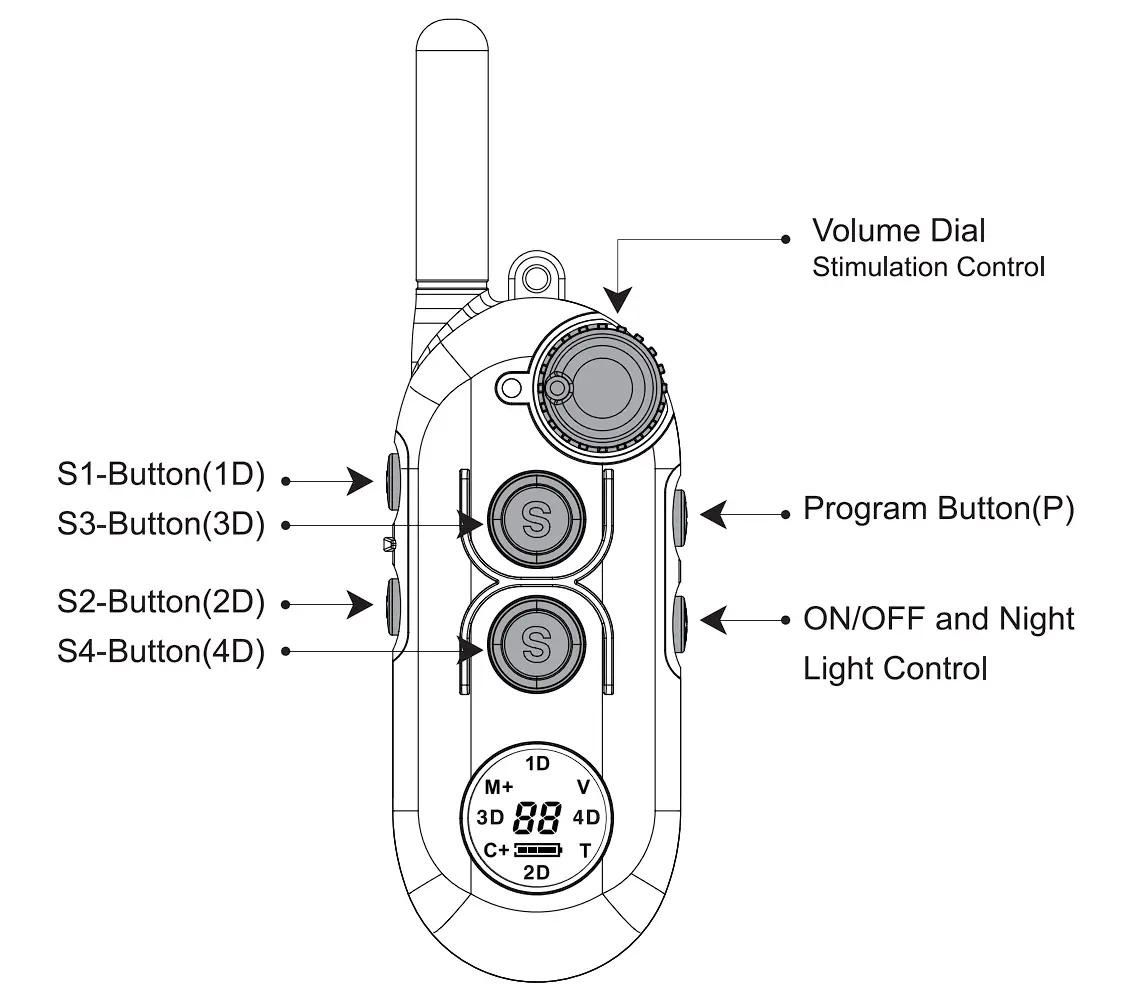 Mode Buttons | When Stimulation level is set to “0” S1(Dog1) mode change: P+S1 (M→C→V→T) S2(Dog2) mode change : P+S2 (M→C→V→T) S3(Dog3) mode change: P+S3 (M→C→V→T) S4(Dog4) mode change : P+S4 (M→C→V→T) | |