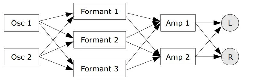 Each voice of the scrooo features two oscillators feeding three separate formant generators. The outputs of the formant generators are routed to two individual amplifiers with panorama control which are connected to the main stereo output bus.