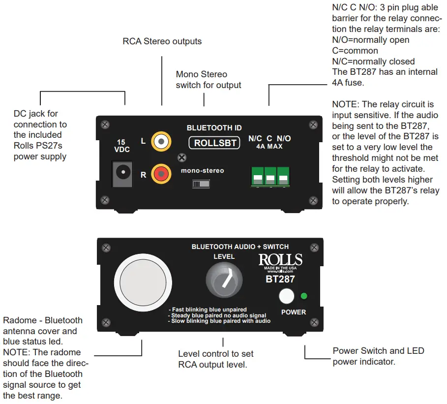 The Rolls BT287 is a Bluetooth interface that will supply stereo or mono audio to a sound system. It also features a 400-watt contact closure relay for activation of the connected system. For example, if you have a sound system such as an old jukebox and want to add Bluetooth capability to it. The BT287 will supply the audio to the jukebox as well as provide a contact closure relay to turn the jukebox on, controlling cabinet lights, amplifier, and audio level remotely. When audio is sent to the BT287 the jukebox will turn on automatically and start playing audio, when Bluetooth audio is not present the jukebox will be powered off by the BT287. This way a homeowner or shop owner could have a piece of equipment (jukebox) remotely controlled via laptop, phone, tablet, or another digital Bluetooth device with the BT287.