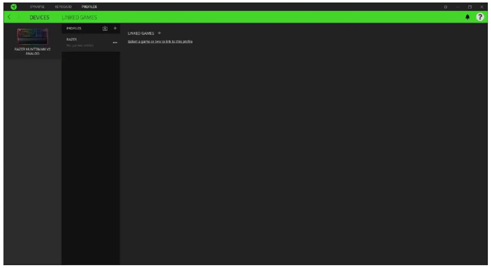 The Linked Games subtab gives you the flexibility to add games, view peripherals that are linked to games, or search for added games. You can also sort games based on alphabetical order, last played, or most played. Added games will still be listed here even if it is not linked to a Razer device.