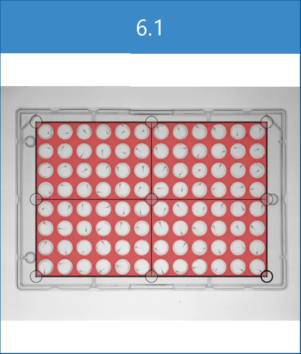 In the Mask tab, use masking tools in Settings panel (6) to mask out any unwanted areas by - choosing tool and dragging on video preview to create a shape. Adjust the shape using anchor 6 points. Objects in red areas will not be tracked. Every closed, non-masked area defines an arena (i.e. there are 97 arenas in the example (6.1)). Save the mask as a file for later use, if needed. Click OK and Next to continue.